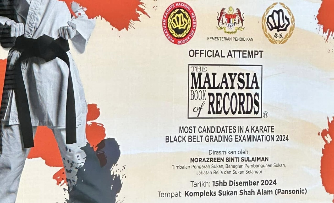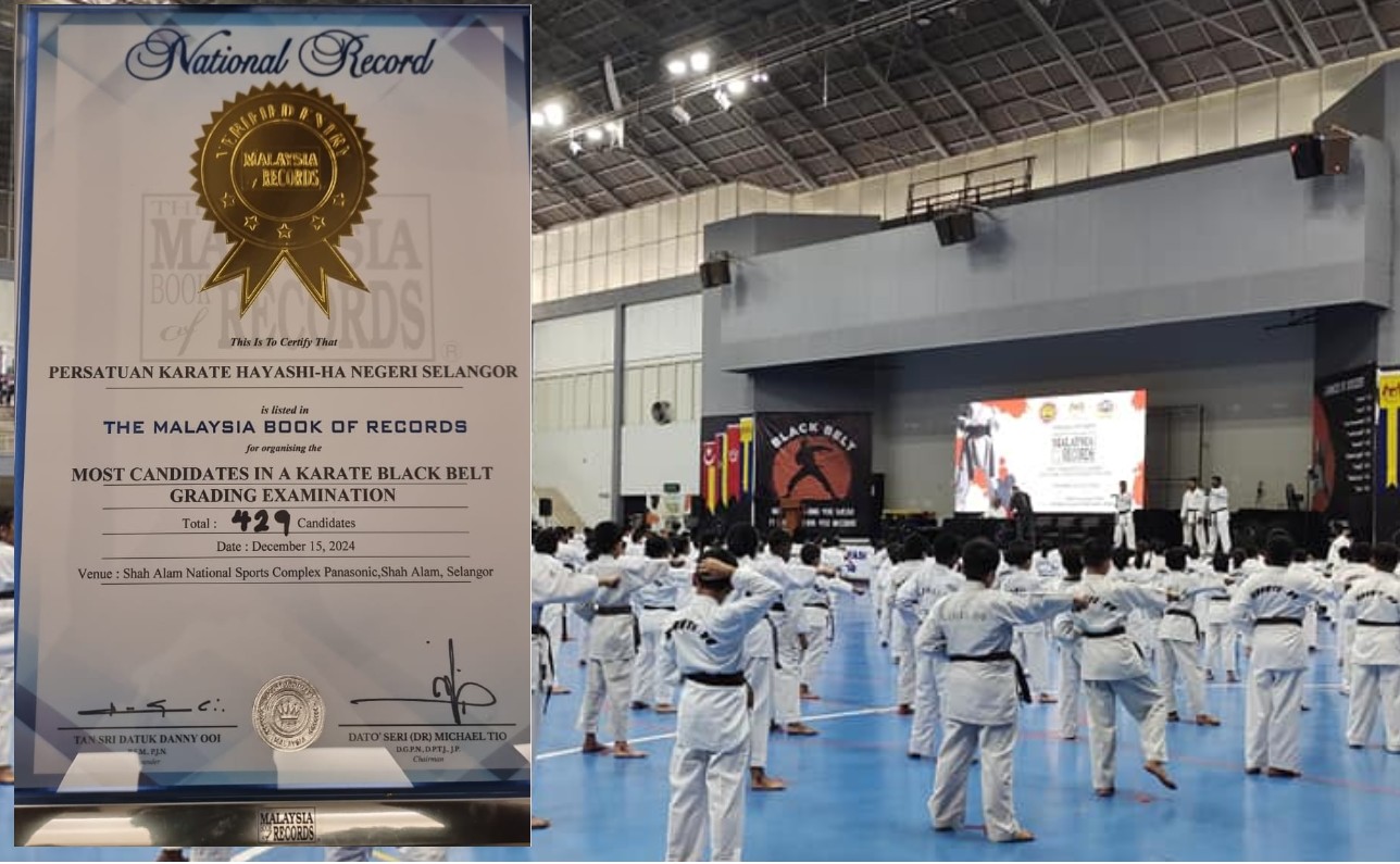 Persatuan Karate Hayashi-Ha Negeri Selangor telah mencipta sejarah hari ini dengan menerima pengiktirafan daripada Malaysia Book of Records (MBOR) untuk jumlah calon paling ramai dalam peperiksaan penggredan tali pinggang hitam karate. Acara bersejarah ini diadakan di Panasonic Sports Complex, Shah Alam, melibatkan 429 pelatih karate dari pelbagai peringkat umur, menjadikannya satu pencapaian yang unik dalam dunia seni mempertahankan diri di Malaysia.